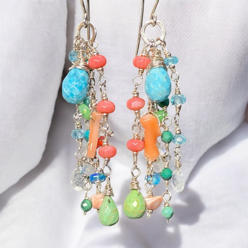 These beautiful, genuine turquoise briolettes dangle with summer hued gemstones of aqua apatite, faceted small turquoise rounds, green and salmon Ethiopian opals, rainbow moonstones rondelles and briolettes and smooth coral beads and green turquoise briolettes to create these feminine, elegant earrings.
