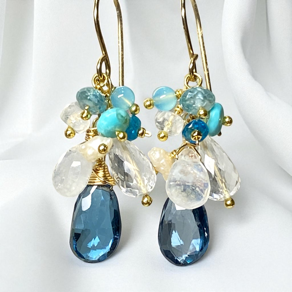 A large, London Blue Topaz, clear crystal quartz and rainbow moonstone briolettes are wire wrapped in 14kt gold filled wires to mix with clusters of rondelles of blue chalcedony, Sleeping Beauty turquoise, neon apatite, natural blue zircon, rainbow moonstone and a small keishi pearl to create these colorful cluster dangle earrings.