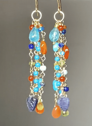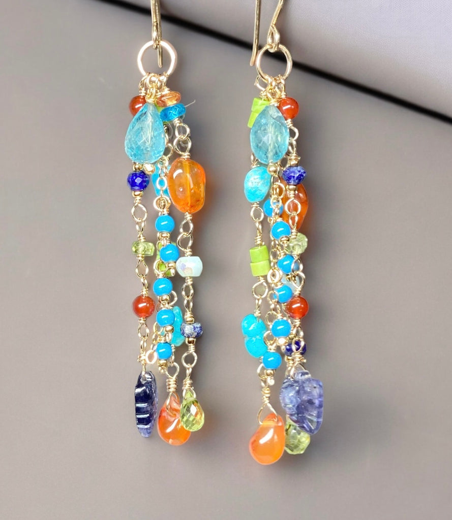 These beautiful aqua apatite briolettes dangle with summer hued gemstones of carnelian, faceted aqua Peruvian opal, Mandarin garnet, neon apatite and blue lapis rondelles, green turquoise tubes, Kingman turquoise nuggets, peridot rounds and smooth round turquoise beads to create these feminine, elegant earrings.