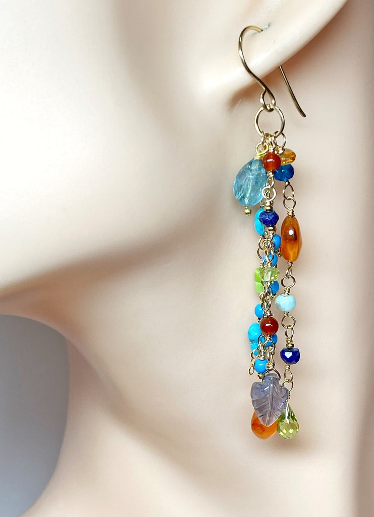 Multi Gemstone Dangle Earrings Blue, Green Turquoise, Carnelian, Peridot, Gold Filled