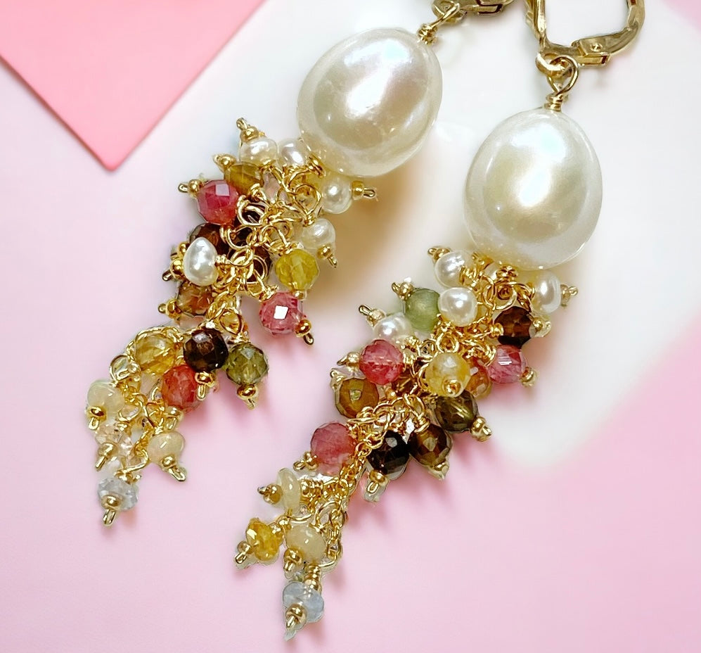Creamy, ivory, freshwater pearls dangle clusters of faceted tourmalines, sapphires, Ethiopian opals and tiny seed pearls to create these romantic earrings.
