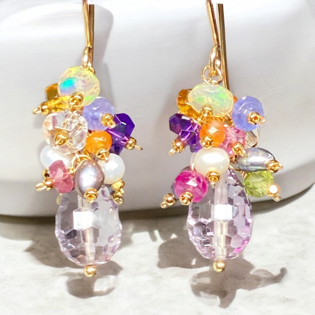 PInk Amethyst Multi Gemstone Cluster Dangle Earrings