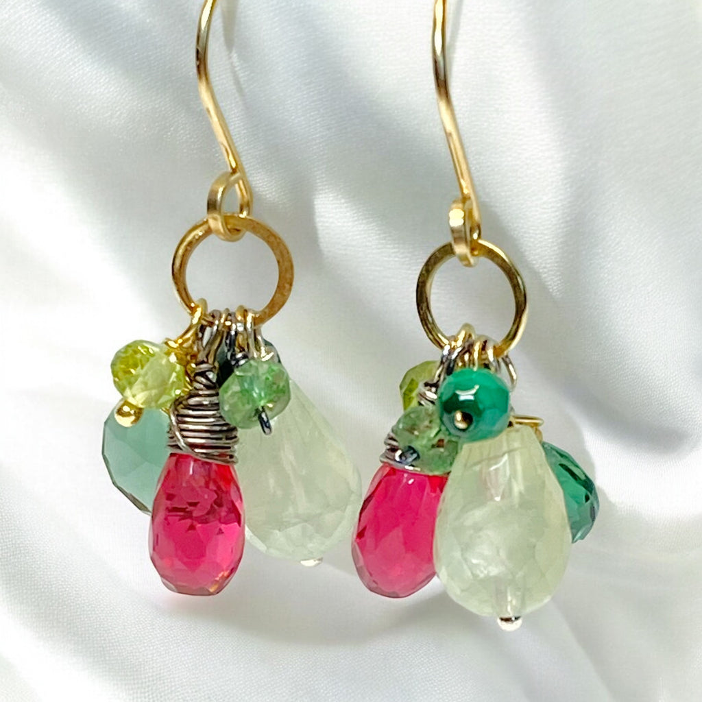 Beautiful, green gemstone briolettes of genuine prehnite and green and pink quartz are wire wrapped to dangle with rondelles of faceted malachite, peridot and green quartz on oxidized sterling silver and gold filled wires to create these very cheerful earrings.