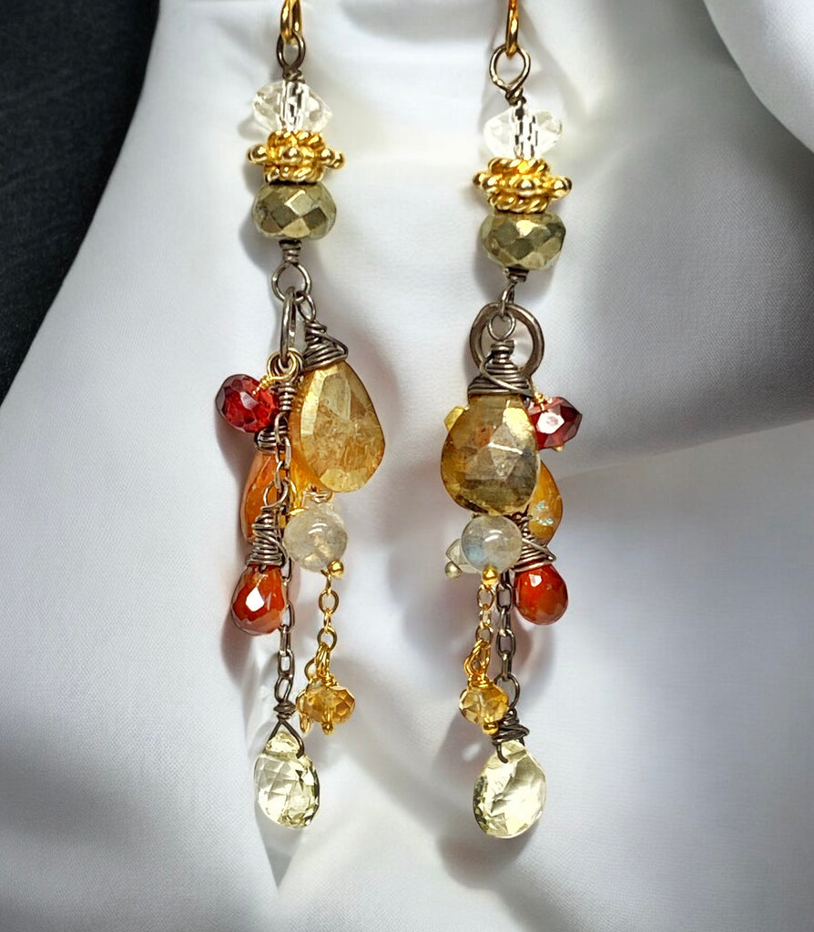 The gems dangling on the chains are mystic golden labradorite, mystic hessonite garnet, scapolite, red garnet, natural hessonite, labradorite, citrine, mystic crystal, and gold vermeil nuggets.