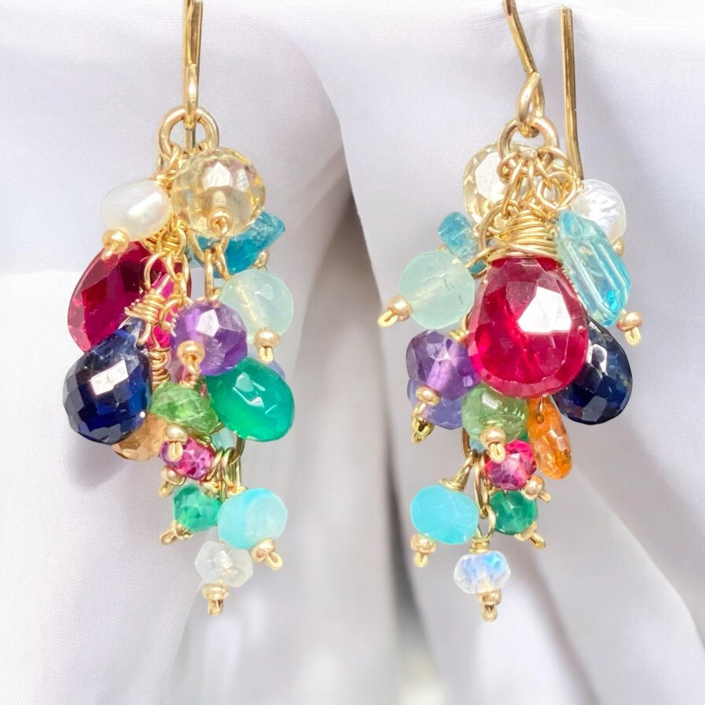 Rainbow Gemstone Cluster Dangle Earrings with Pink Red Topaz Gold Fill