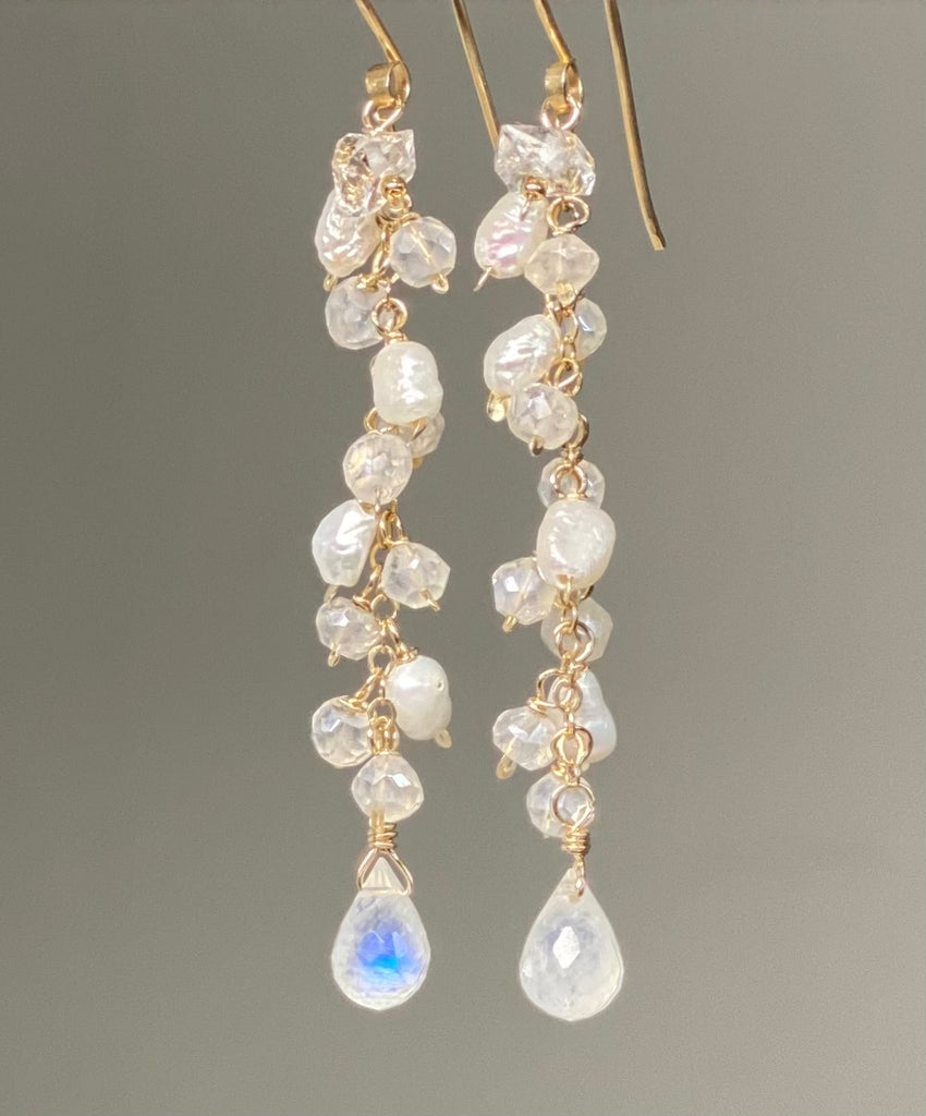Rainbow moonstone faceted teardrops dangle on chains with cascades of freshwater pearls and mystic crystal quartz rondelles to create these elegant, glamorous long earrings.