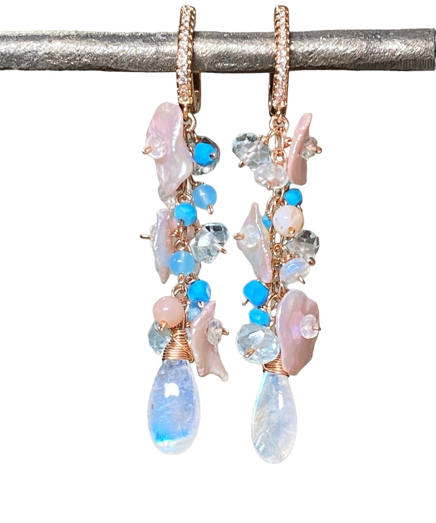 Smooth teardrops of rainbow moonstone, 15 mm, dangle below cascading clusters of pastel mixed color - aqua, light blue and pink - aquamarine, amazonite, and mystic crystal rondelles mounted on rose gold fill headpins with blush pink freshwater keishi pearls for a feminine, dreamy, ethereal elegant look for Spring/Summer/Resort.