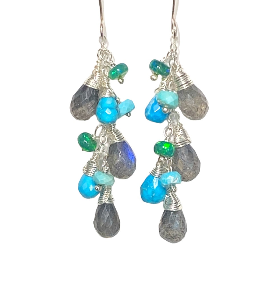 Faceted turquoise briolettes, wire wrapped in sterling silver wires, dangle with blue flash labradorite and peacock Ethiopian opals and colorful rondelles of Sleeping Beauty turquoise mounted on headpins on sterling silver chains to create these cheerful earrings.