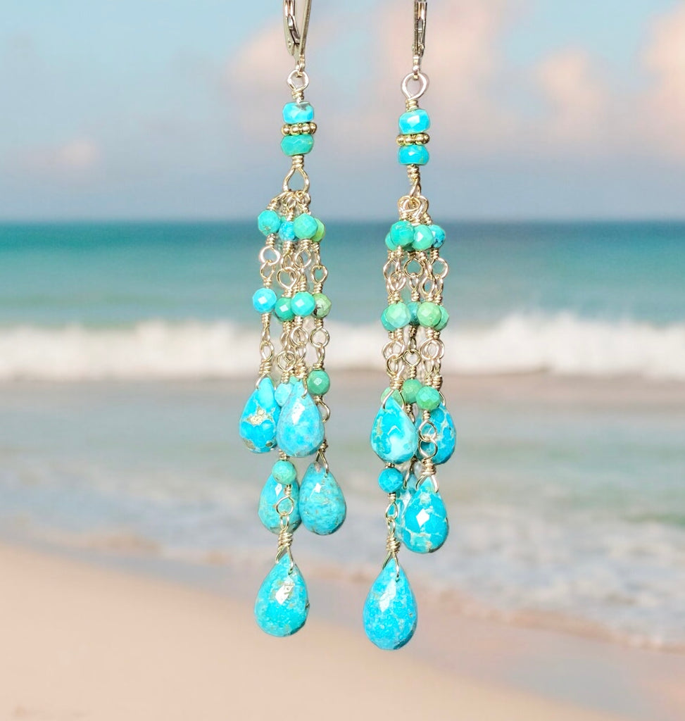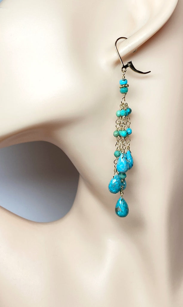 Natural. beautiful turquoise faceted teardrop gemstone briolettes dangle from wire wrapped strands of faceted, natural turquoise rounds that connect to stations of turquoise rondelles with gold vermeil daisies to create these flirty turquoise boho earrings.