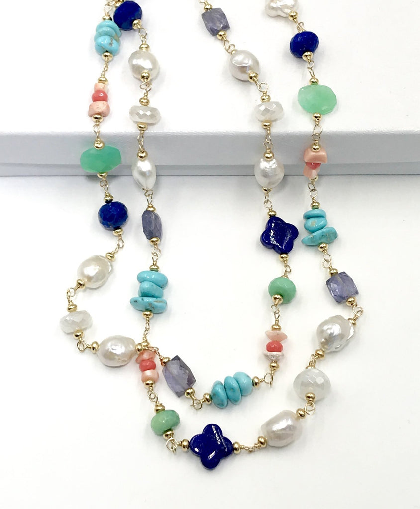 Multi Gemstone Pearl Long Gold Necklace Coral Lapis Chrysoprase