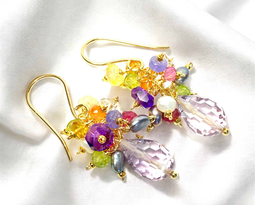 Beautiful, pink amethyst faceted teardrop briolettes dangle beneath clusters of small freshwater pearls in white and gray and gemstone rondelles of tanzanite, Ethiopian opal, carnelian, citrine, pink tourmaline, amethyst, crystal quartzpink quartz, and peridot.