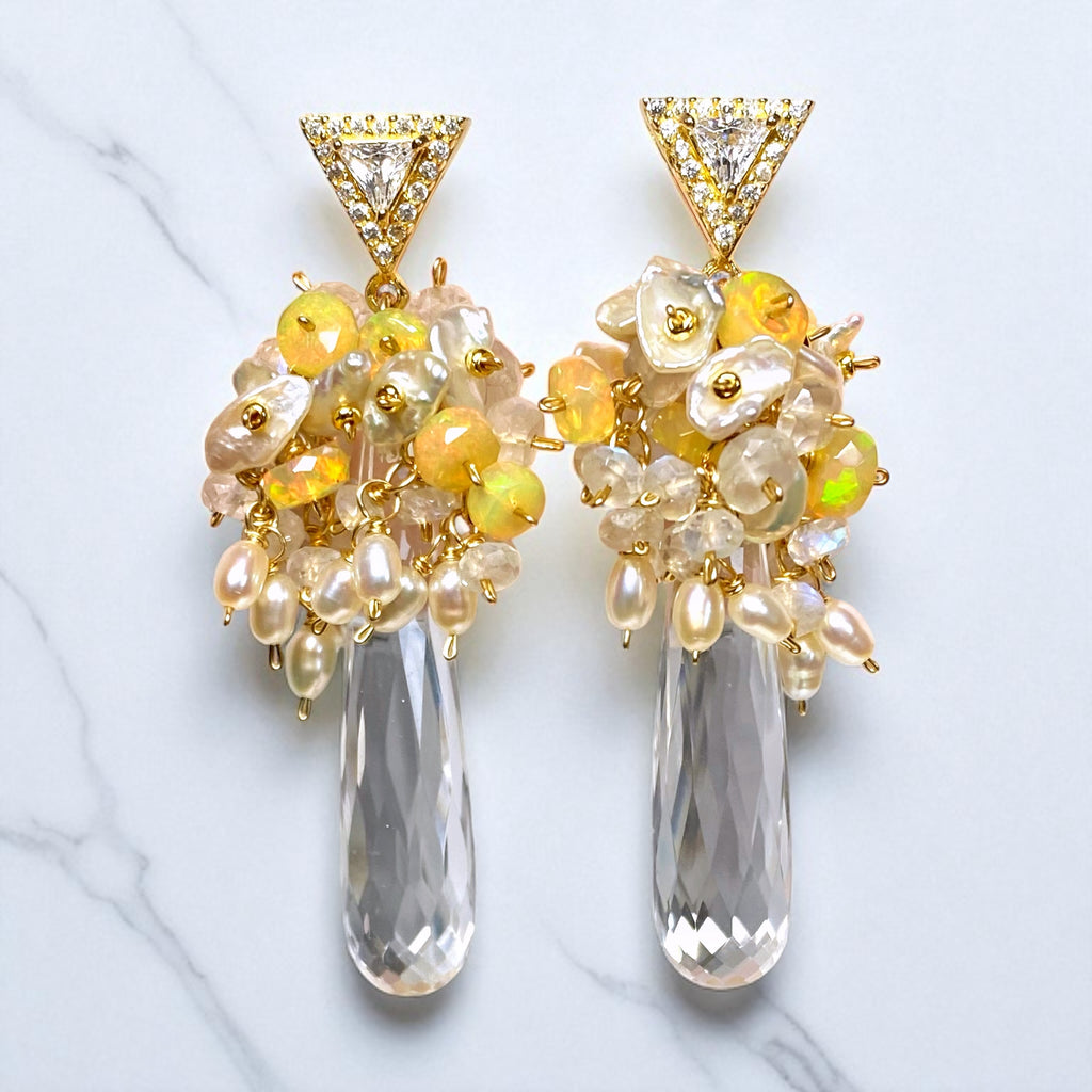 Crystal Quartz Opal and Moonstone Cluster Earrings Gold Post