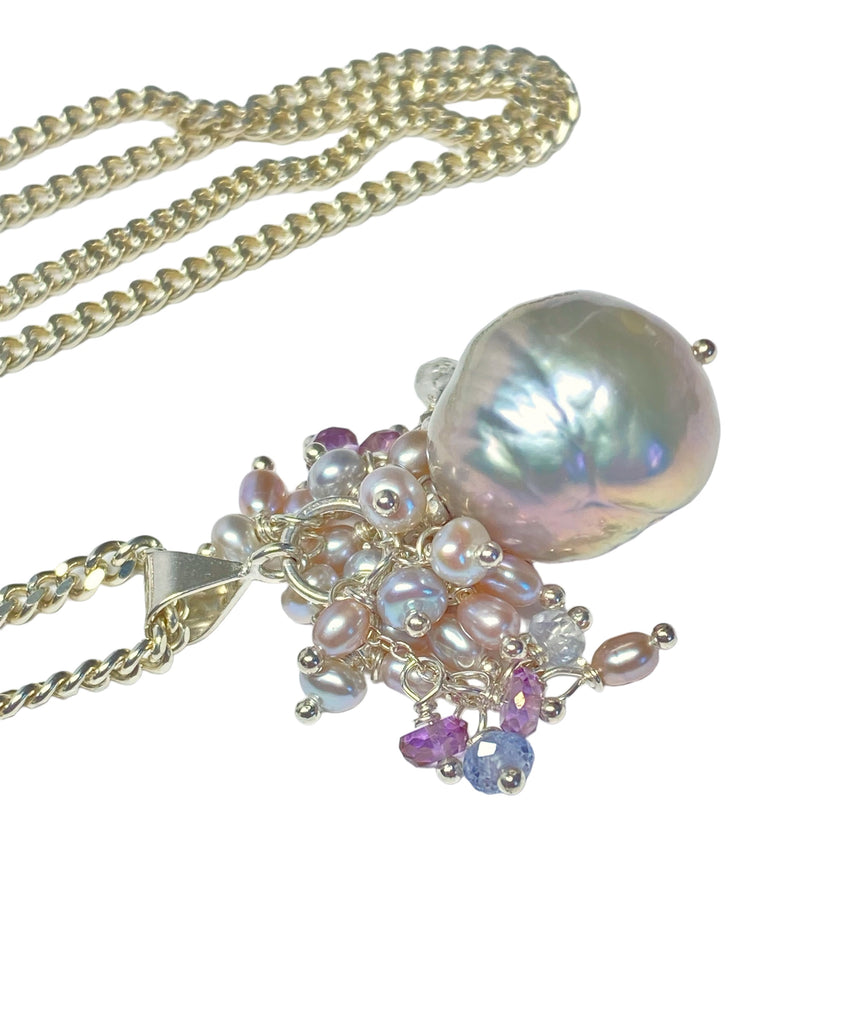 Also in the pearl cascades are tiny, sparkly mystic pink topaz and silver sapphire rondelles adding some sparkle and highlighting the stunning lavender pink hues of this romantic pearl pendant.