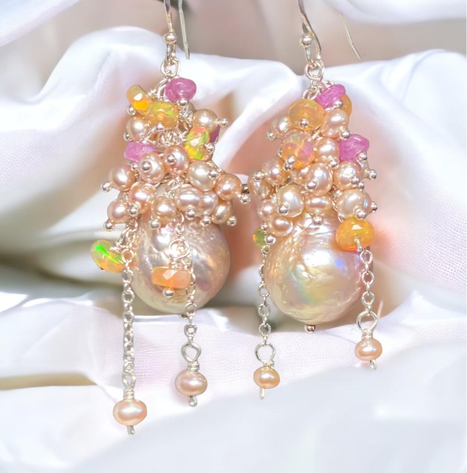 Very beautiful blush pink baroque pearls with a lightly metallic sheen, dangle beneath lavish cascades and clusters of lustrous, tiny natural pink freshwater pearls, mixed with AAAA fiery Pink Panther Ethiopian opals and high quality pink sapphire rondelles to create these special pearl earrings.