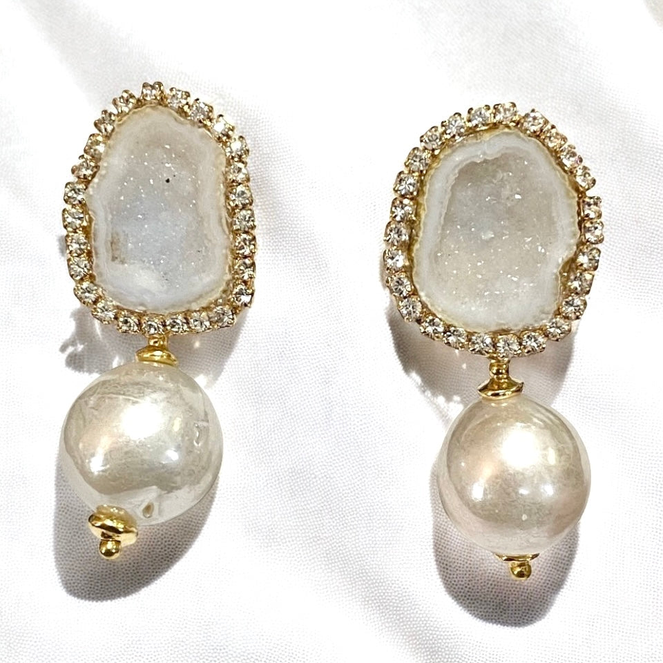 Extra lustrous, baroque Edison pearls in white dangle below the geodes.