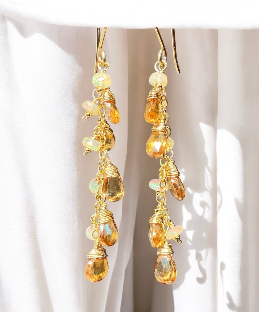 Fantastically sparkly, mystic golden topaz faceted briolettes dazzle in the light dangling on 14 kt gold filled chains with very fiery, AAA Ethiopian opal faceted rondelles to create these festive earrings.