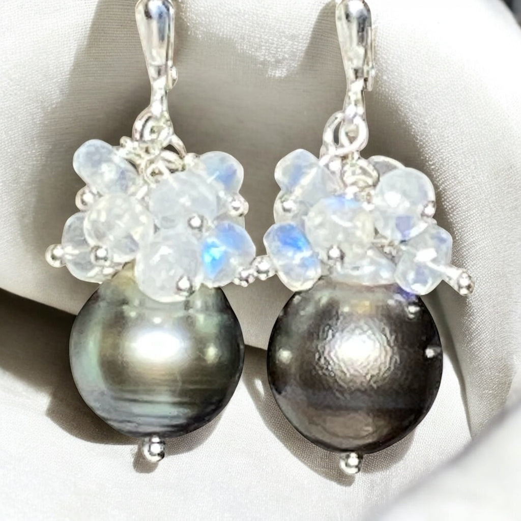 Tahitian Pearl Moonstone Cluster Earrings Sterling Silver