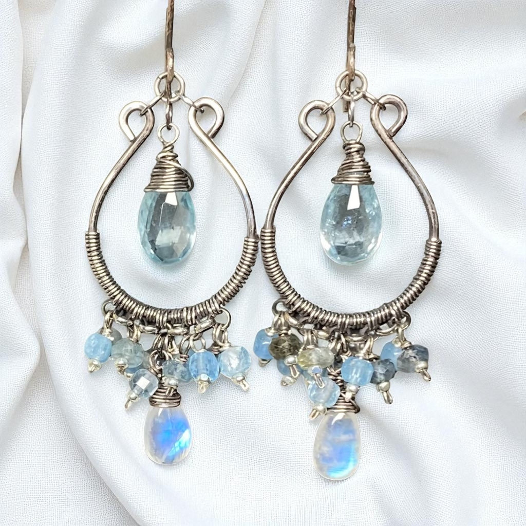 Beautiful, shimmering, high quality, transparent aquamarine briolettes, 14 mm, center hand forged oxidized and polished sterling silver hoops, mixing with strong blue flash moonstone briolettes and more aquamarine gems at the bottoms.