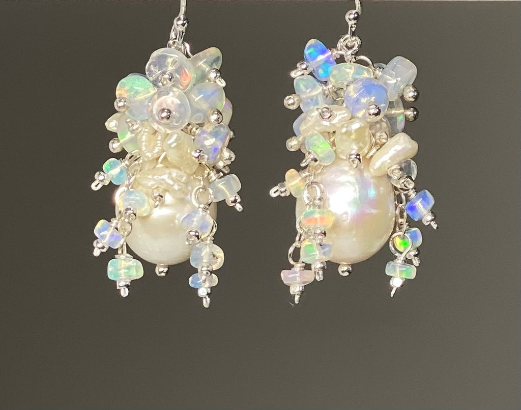 Cascading down the sides of the pearls are dainty chains of wire wrapped small Ethiopian opals and keishi pearls, all mounted on sterling silver headpins with tiny faceted silver beads for more light reflection.