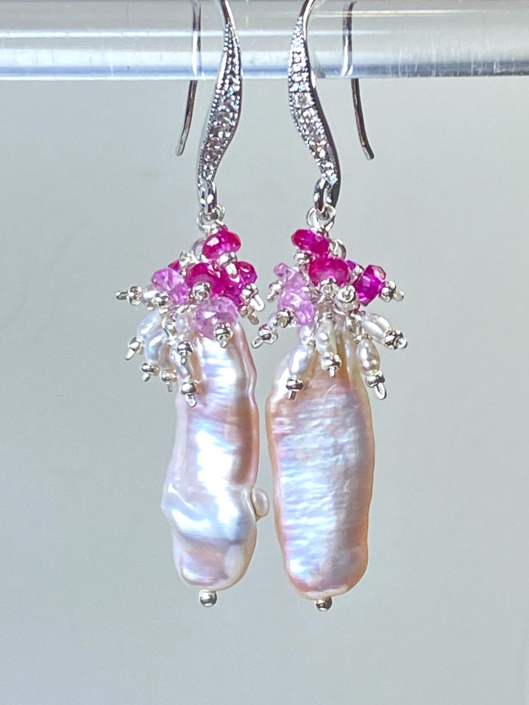 Biwa Pearl Dangle Earrings, Pink Red Ruby Clusters Sterling Silver