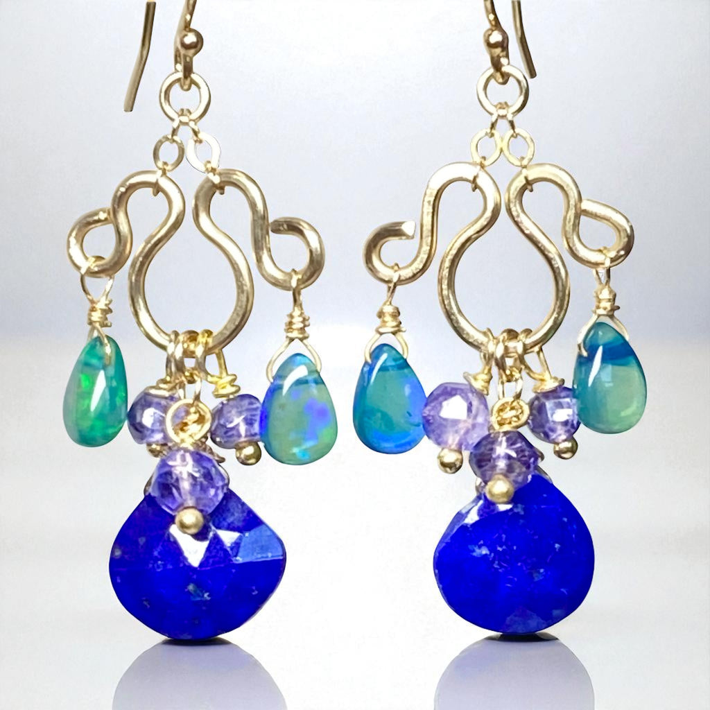 Blue lapis faceted briolettes, 8 mm, dangle with blue violet quartz beads, 3 mm, and vivid peacock blue Ethiopian opal briolettes to create these blue violet gold filled, hand forged chandelier earrings.