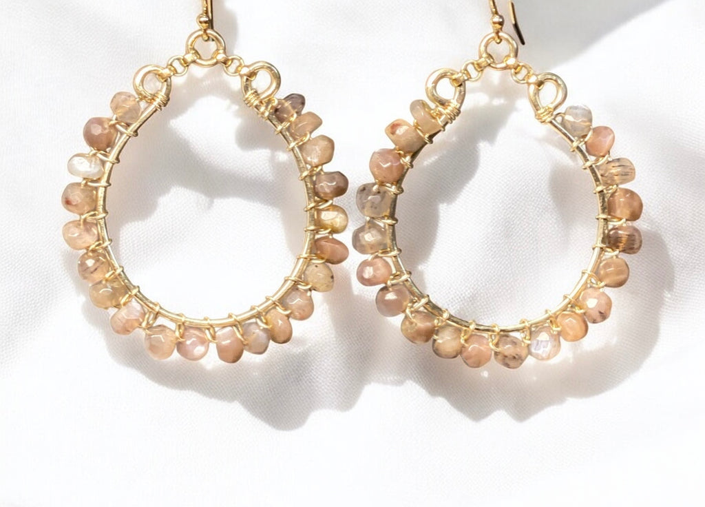 Beautiful, chocolate moonstone faceted rondelles are wire wrapped around hand forged 14 kt gold filled or sterling silver hoop earrings to create these stylish earrings.