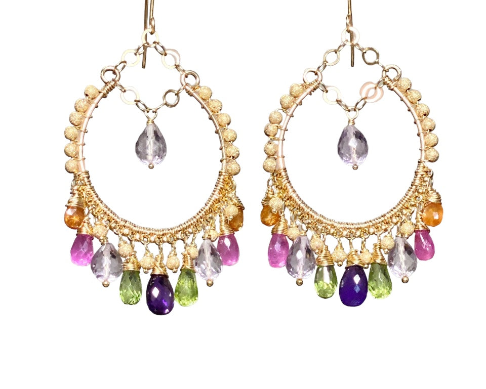 Colorful gemstones of AAA deep purple amethyst mix with peridot teardrops, pink amethyst teardrops, pink sapphire teardrops and mandarin garnet pear briolettes.