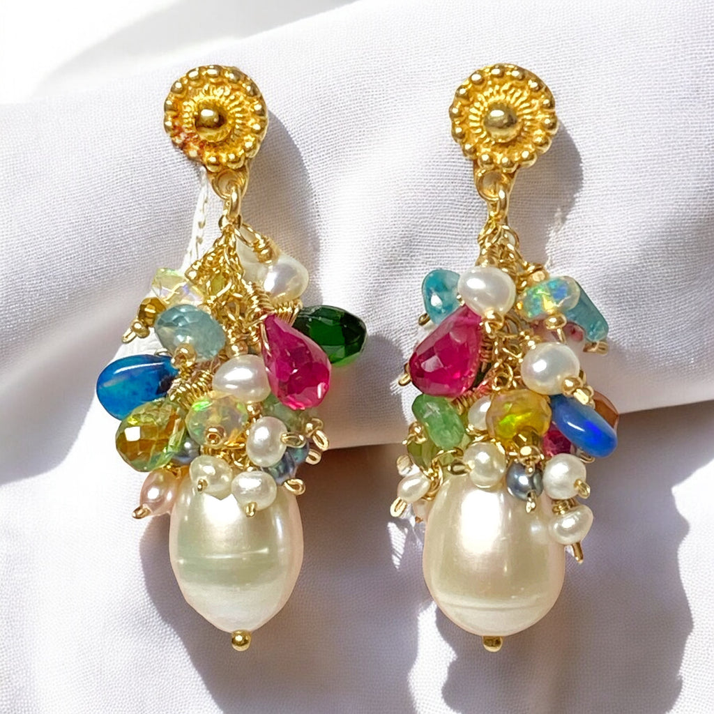 Vividly colorful gemstones and cascades of tiny white and pink pearls form lush draping clusters over ivory baroque, 11 mm, freshwater pearls to create these garden inspired earrings.