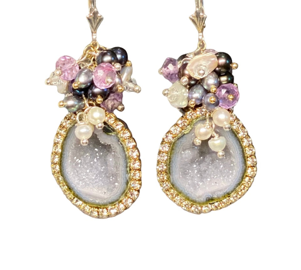 Grey Tabasco Geode Earrings with Diamond Look Austrian Crystals and Amethyst Pearl Clusters