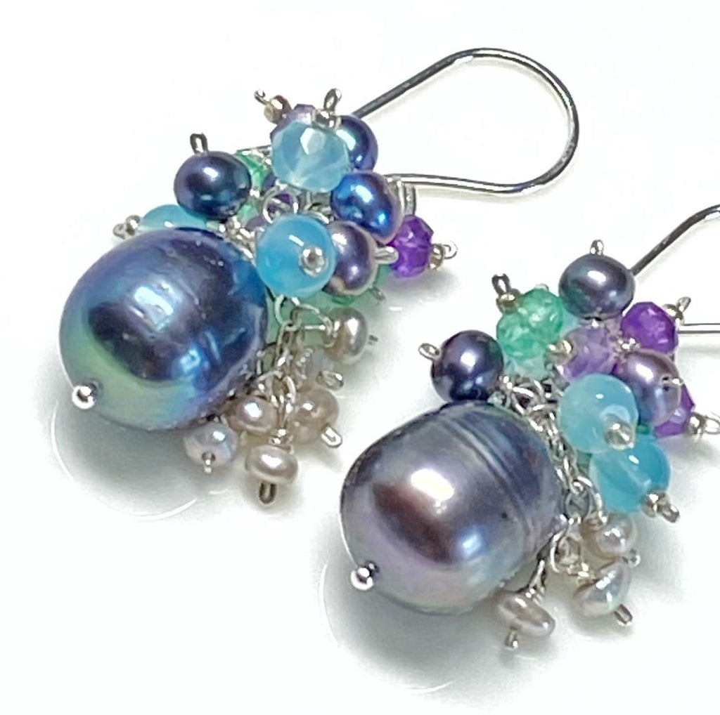 Peacock Pearl, Amethyst, Blue Aqua Chalcedony, Cluster Waterfall Earrings