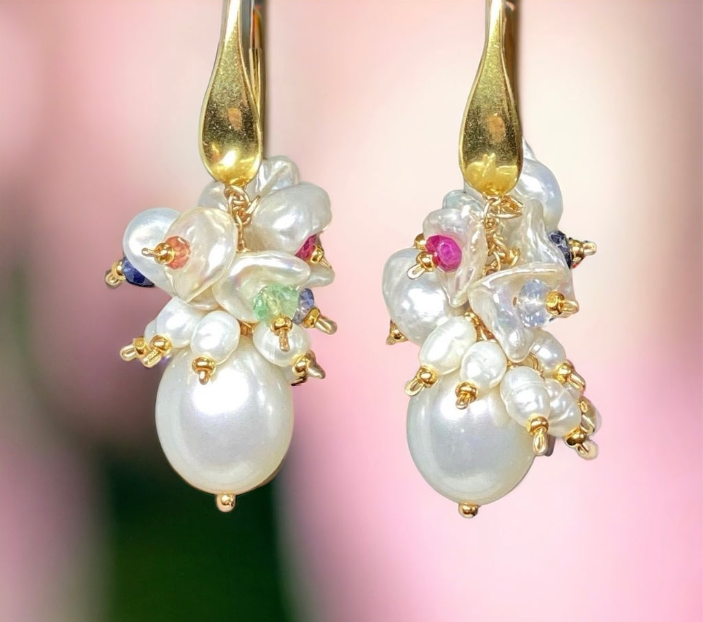 Pearl Cluster Earrings with Multicolor Sapphire Gemstone Keishi Pearls Gold Fill