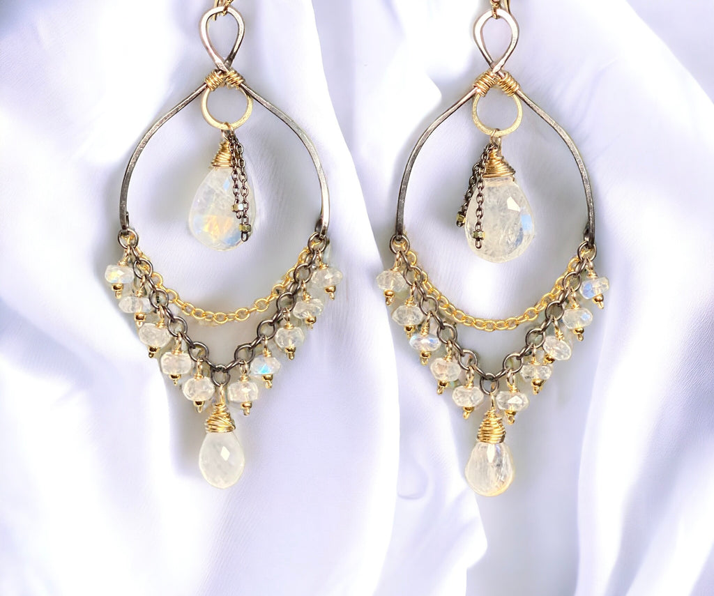 Hand forged, oxidized and polished earring forms dangle wire wrapped, very flashy, rainbow moonstone briolettes, 12 x 11 mm, in their centers and smaller teardrop briolettes on the bottoms to create these feminine, boho chandelier earrings.