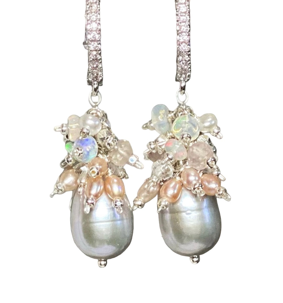 Silver Gray Pearl Earrings with Opal Clusters Sterling Silver