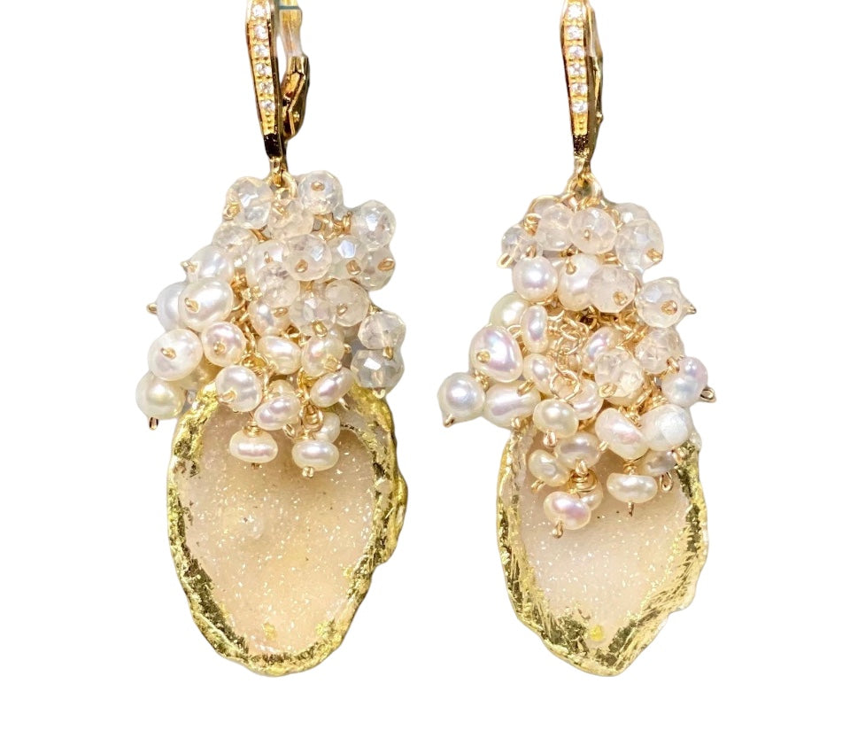 Golden ivory tabasco geode druzy crystal saucers shimmer softly in these tabasco geode slices while dangling from ear wires beneath lavish clusters of mystic crystal quartz and freshwater pearls to create these romantic boho wedding earrings.