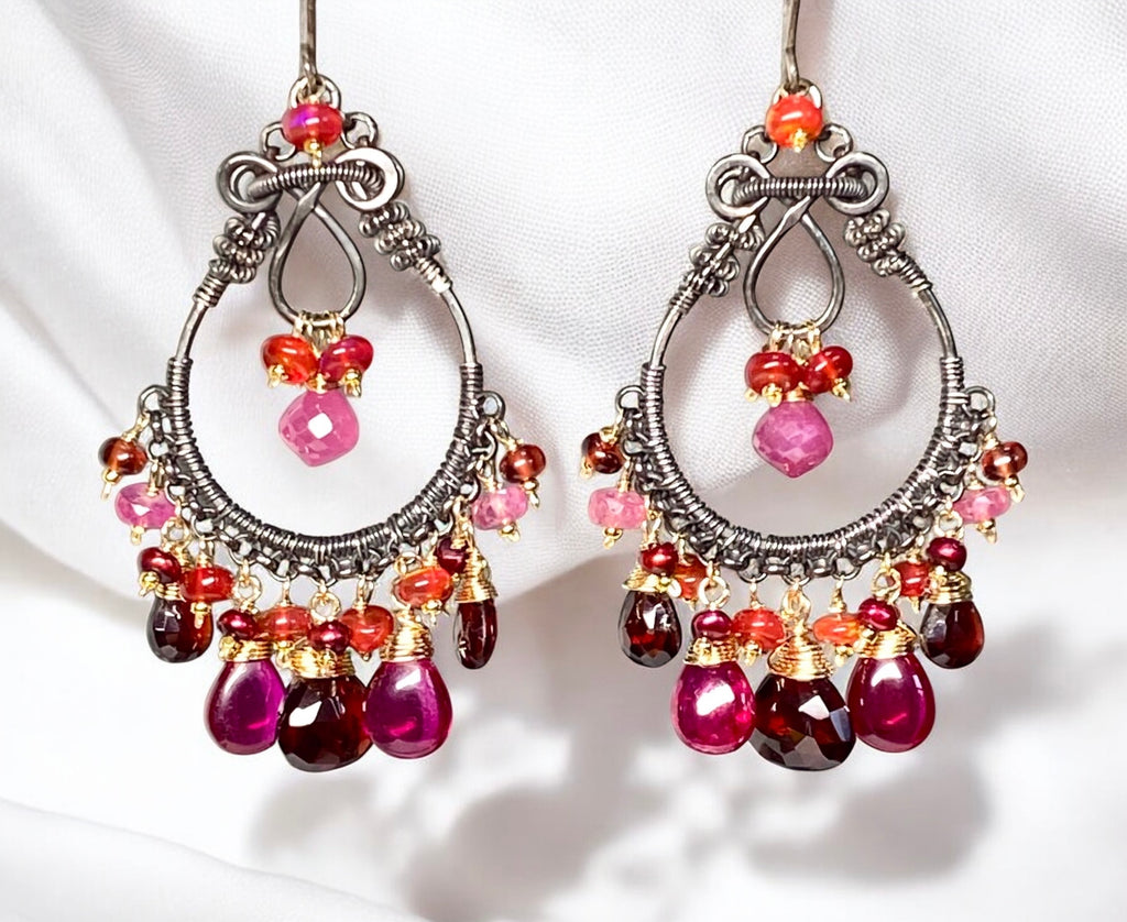 Hand forged sterling silver chandelier forms dangle richly hued gemstones of beautiful red garnets, rubellite quartz, pink sapphire, custom made fiery red opals, red pearls and more garnets.