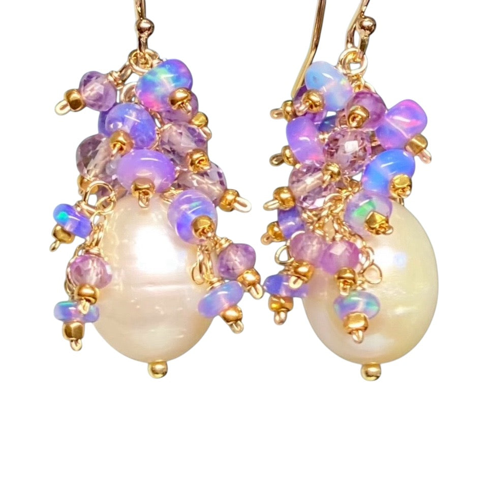 Ivory freshwater pearls, 12mm, dangle beneath wire wrapped gemstone clusters of lavender blue fiery Ethiopian opals, tiny pearls, and pink amethyst rondelles to create these handmade, gold filled earrings.
