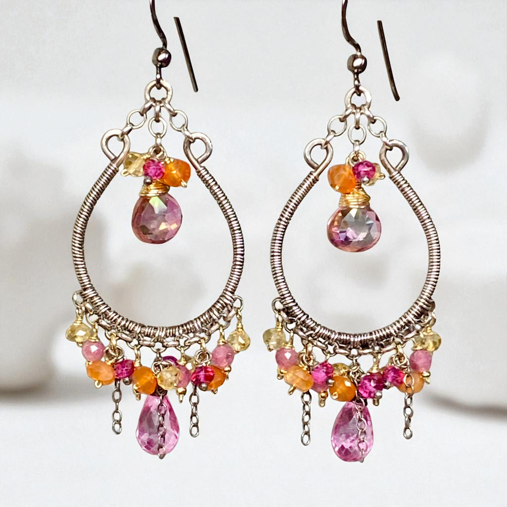 Multi-color Gemstone Hoop Chandelier Earrings in Mixed Metals