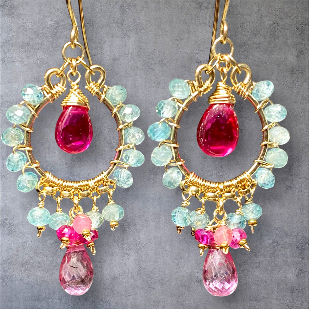 These stunning chandelier hoop earrings feature brilliant natural blue zircons that sparkle like diamonds, paired with vibrant fuchsia rubellite corundum, pink mystic topaz, ruby rondelles, and pink tourmaline rondelles, all wire-wrapped in luxurious 14K gold fill. Each earring is a wearable work of art, perfect for making a statement at resort destinations, elegant celebrations, or elevating your everyday style with bold color.