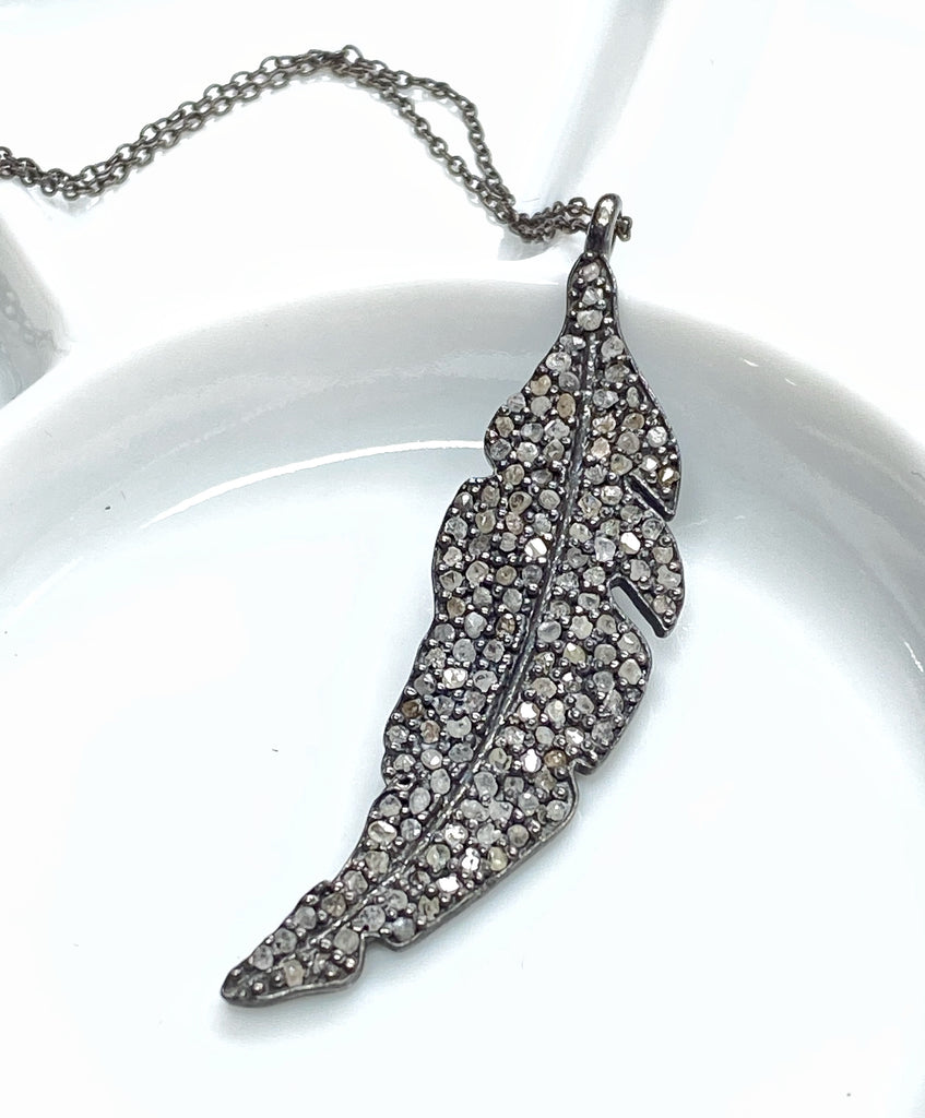 A shimmering, twinkling feather pendant charm of natural, small diamond pave slices on oxidized sterling silver dangles from dainty oxidized sterling silver dainty chain to create this fresh, bohemian necklace.