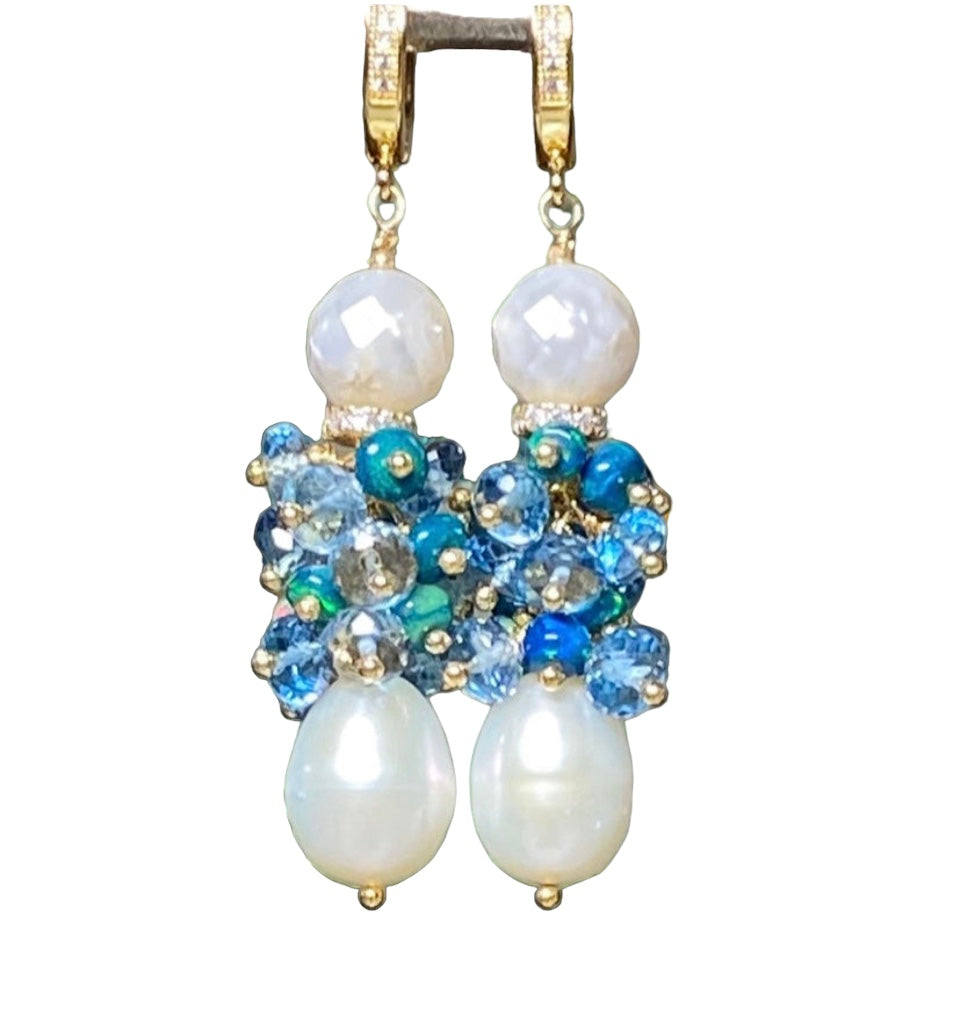 Pearl and London Blue Topaz and Opal Cluster Earrings
