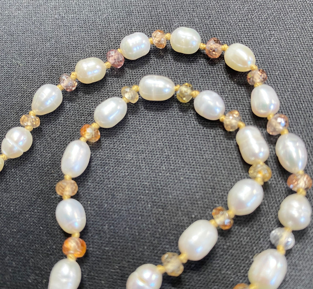 Pearl Necklace with Natural Zircon Gemstones, Silk Knotted, Gold Fill