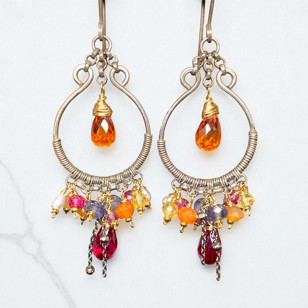 Beautiful, high quality, Mandarin garnet and rubellite hydroquartz briolettes, 10 mm, center hand forged oxidized and polished sterling silver hoops, mixing with colorful mixed gems in autumn colors at the bottoms.