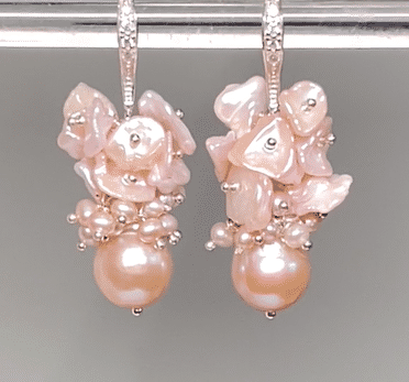 Gleaming blush pink freshwater pearls, approx. 11mm, dangle beneath clusters of cascading tiny blush pink freshwater pearls.