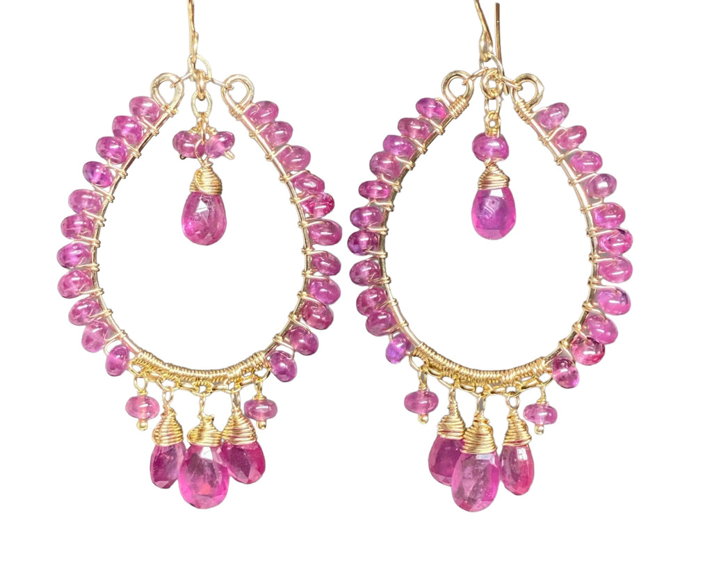 Pink Sapphire Chandelier Hoop Earrings Gold Fill