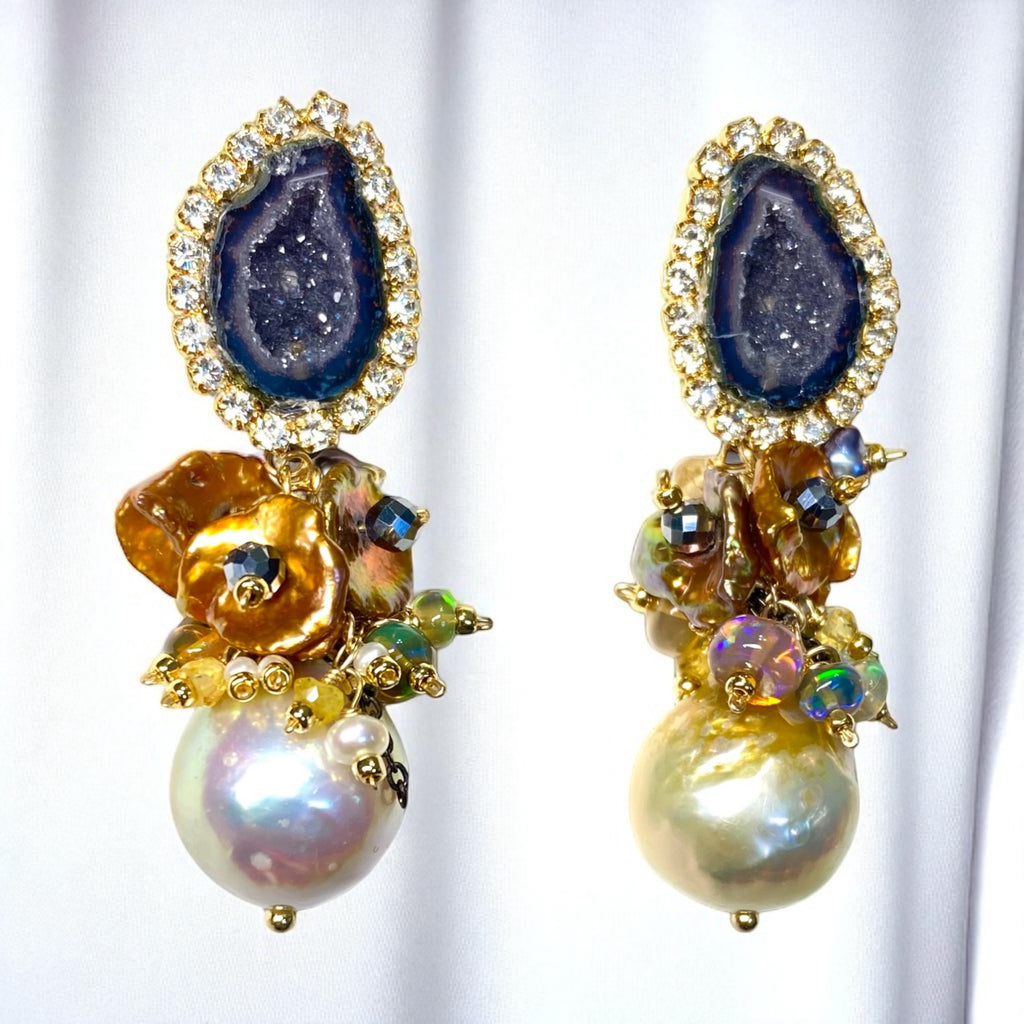 Black tabasco geode slices, with deep grey hued druzy crystals, dangle lustrous, iridescent baroque pond slime pearls to create these mesmerizing raw druzy crystal earrings.