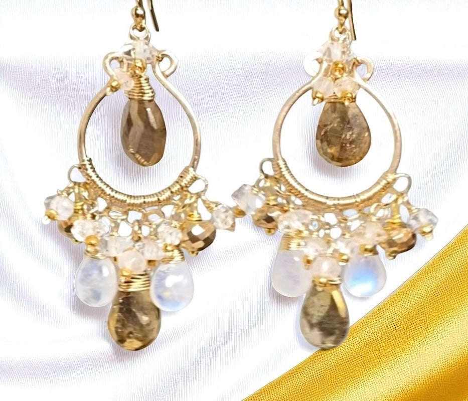 Rainbow Moonstone Gold Labradorite Chandelier Hoop Earrings Gold Fill