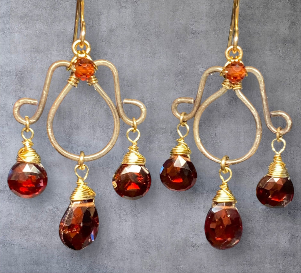 Faceted red garnet briolettes shimmer in the most brilliant crimson, wire-wrapped in 14kt gold-filled wire and suspended from oxidized sterling silver chandelier frames.
