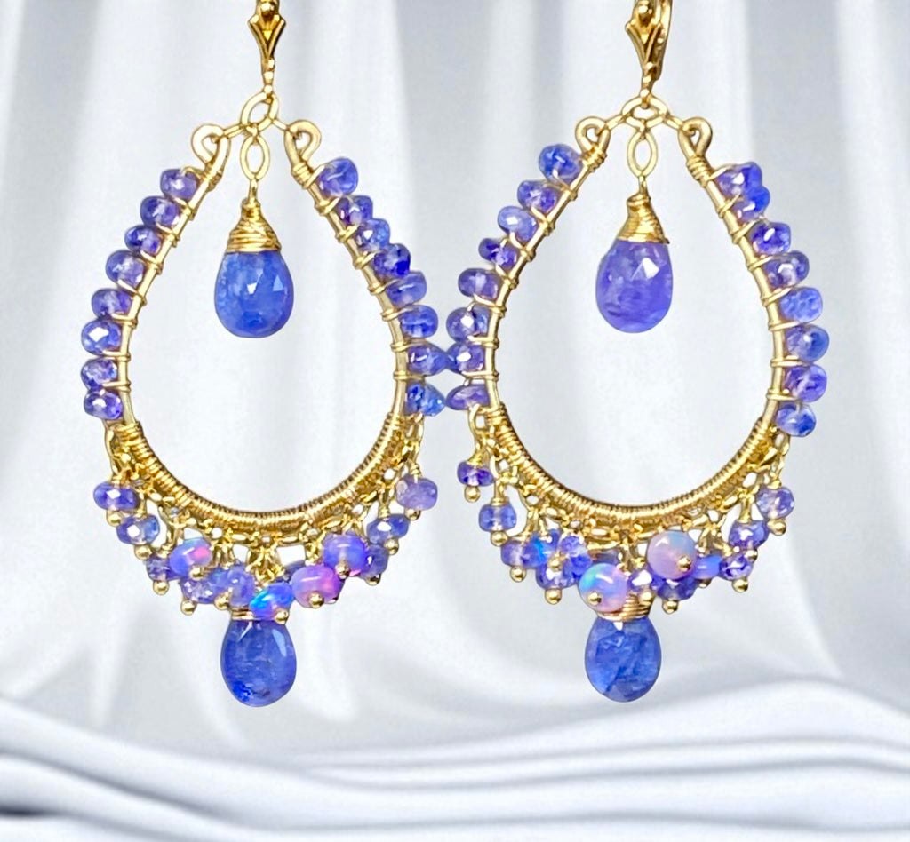 Tanzanite and Opal Hoop Earrings in Gold Fill