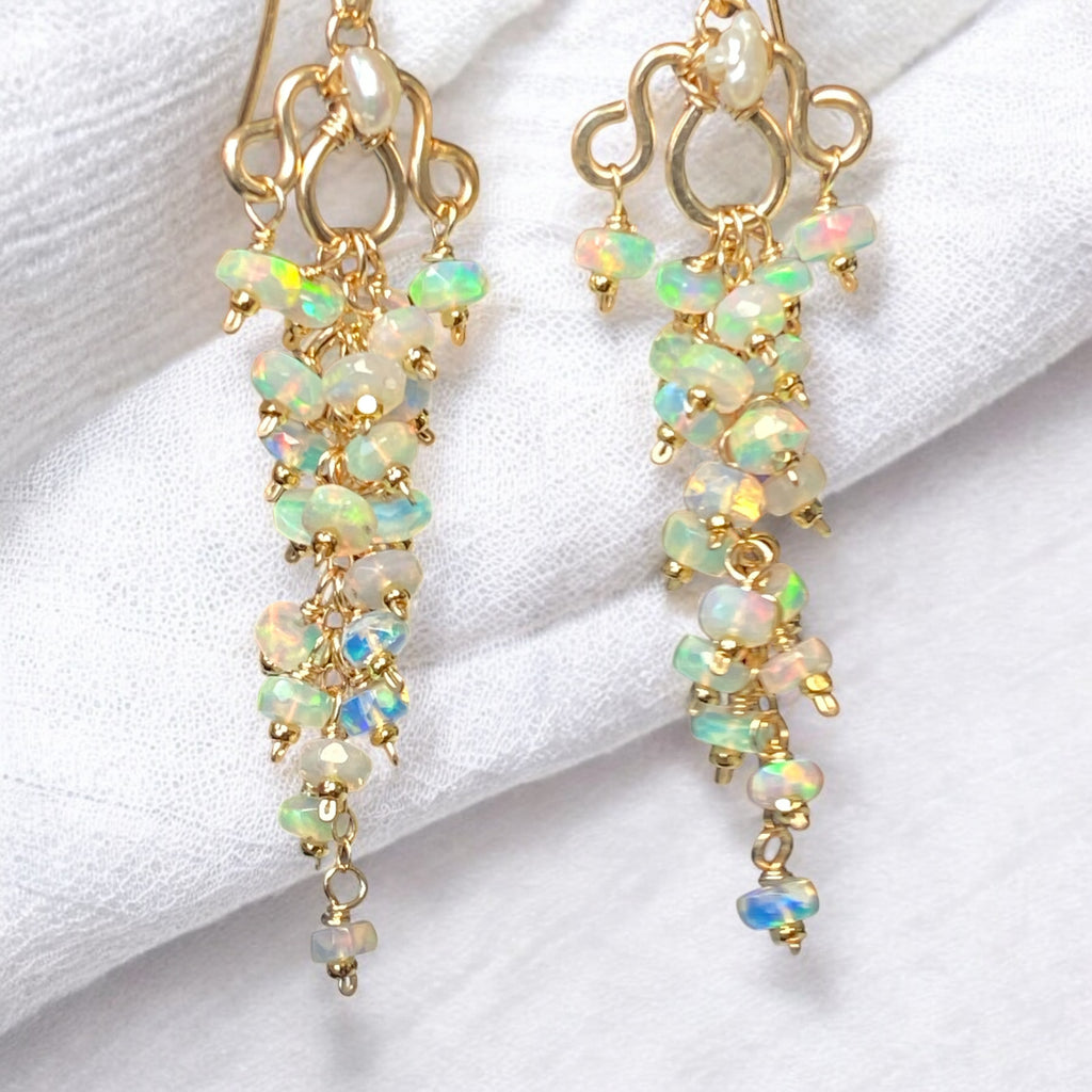 Super fiery, faceted white Ethiopian opals, AAA, are wire wrapped to dangle on 14 kt gold filled chains and wires on hand forged 14 kt gold filled chandelier forms to create these dazzling earrings!