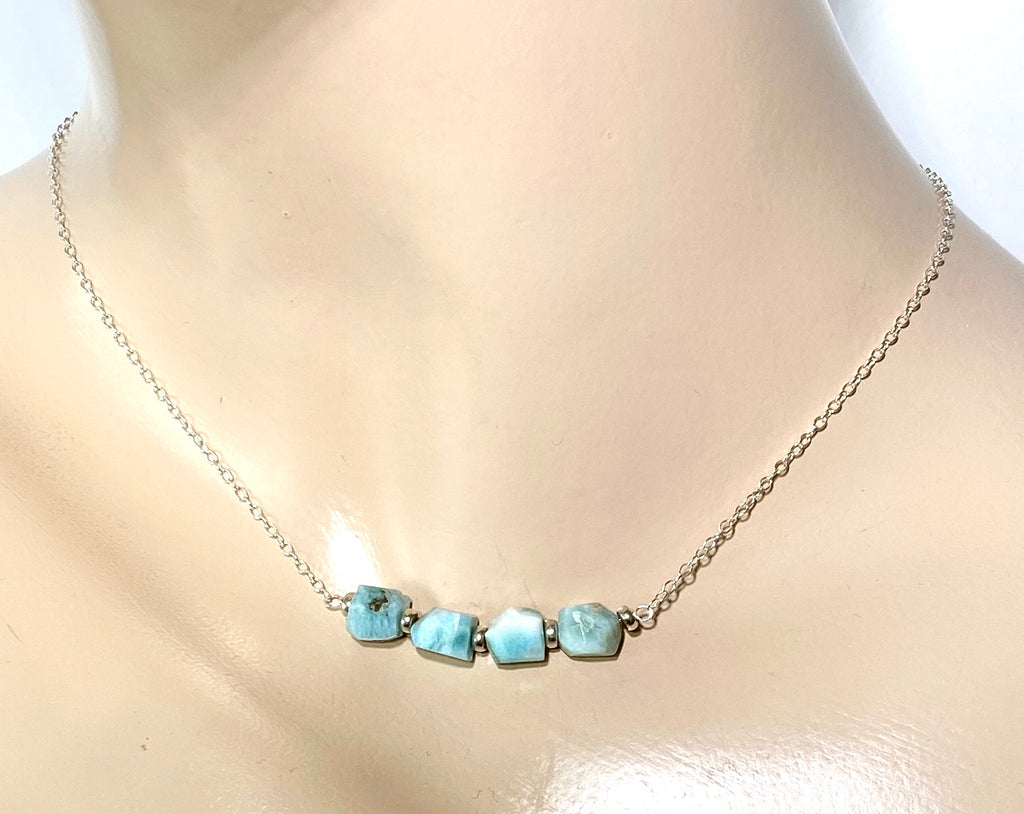 Natural larimar gemstone nuggets, 6-7 mm, mounted on sterling silver wire and chain, combine to create this horizontal necklace.